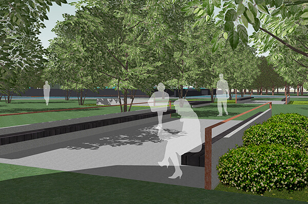 The design approach was laid out as a contemplative walk along the axis from the circle to the centre where the large sculpturesque obelisks were placed and walk continuing to the other end of the site. The idea being the site is not a destination but a part of the activity of people coming to the area. The first part of this walk begins from a pedestrian entry plaza located at the circle. Sculpturesque seaters aligned with granite cladded detailed obelisks were designed demarcating the boundary of the paved plaza and entry to the memorial garden. The intermediate commemorative walk in the memorial garden consists of walls etched with memories of the police martyrs along with spread out seating. The destination is the group of monumental sculptures juxtaposed in the centre of a water body etching a memory of the martyrs.